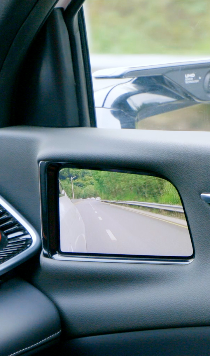 車規(guī)級OLED柔性屏貼合A柱設計,通過算法實現A柱“透明化、可視化”,不影響造型美觀與A柱強度情況下,完美解決A柱盲區(qū)問題。